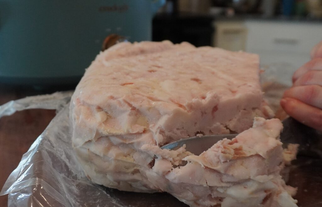Every processing facility is different, so your lard may be packaged differently. Ours usually gives us large packs of lard. The batch I did here was about five pounds.